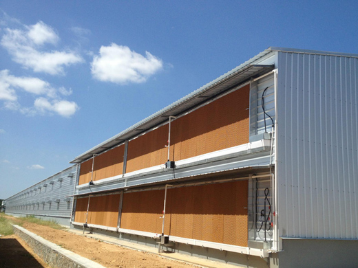ZR濕簾降溫系統(tǒng)的降溫過程是在基核心-ZR紙墊內(nèi)完成的。在波紋的纖維紙表面有層薄薄的水膜,當(dāng)室外干熱空氣被風(fēng)機抽吸穿過紙墊時,水膜上的水會吸收空氣中的熱量進(jìn)而蒸發(fā)在水蒸氣,這樣經(jīng)過處理后的涼爽濕潤的空氣就進(jìn)入室內(nèi)了。這自然的過程猶如風(fēng)吹過水面一樣。
